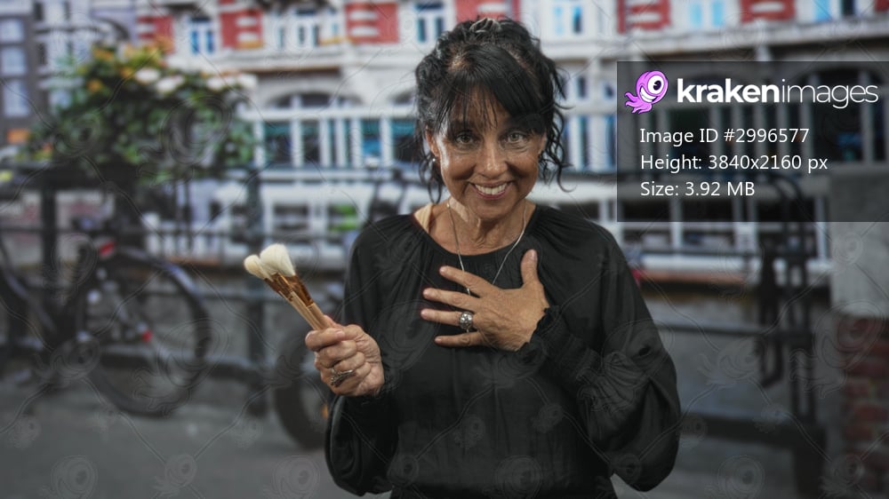 Woman holding makeup brushes to her chest with hands visible on a busy city street beside bicycles and railings; gratitude joy.