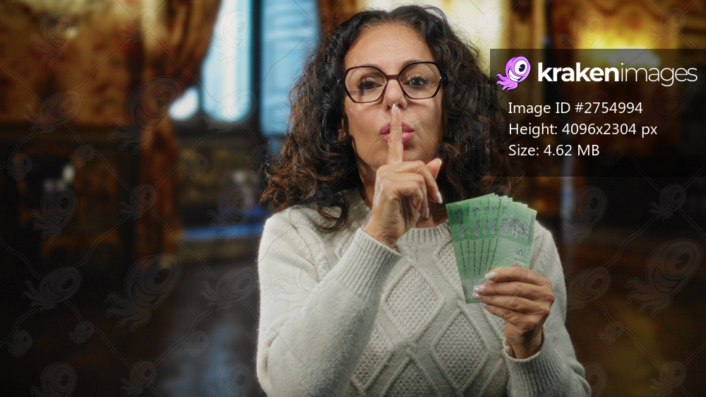 Woman holding malaysian ringgit indoors near hotel reception making a shushing gesture, suggesting secrecy or privacy in a financial transaction.