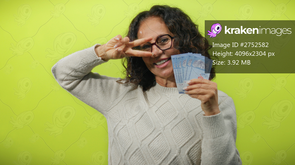 Woman holding malaysian ringgit, making peace gesture against a yellow background, showcasing confidence and positivity, ideal for financial or lifestyle themes. - Kraken Images