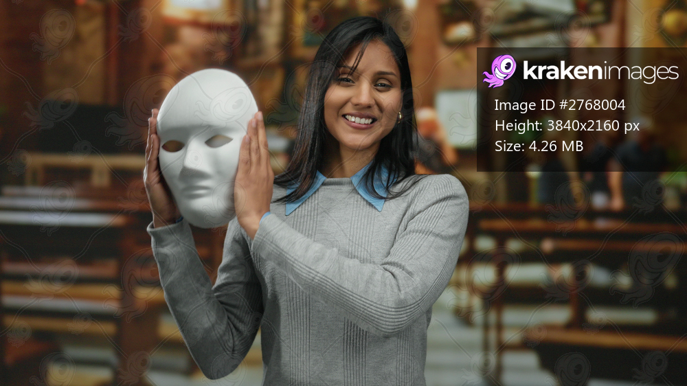 Woman holding mask inside church smiling removing mask showing face latin female indoors professional setting young adult photographing powerful background new environment - Kraken Images