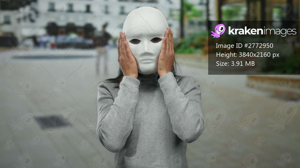 Woman holding mask on urban street while unveiling face outdoors in city setting, representing identity, mystery, and transformation.