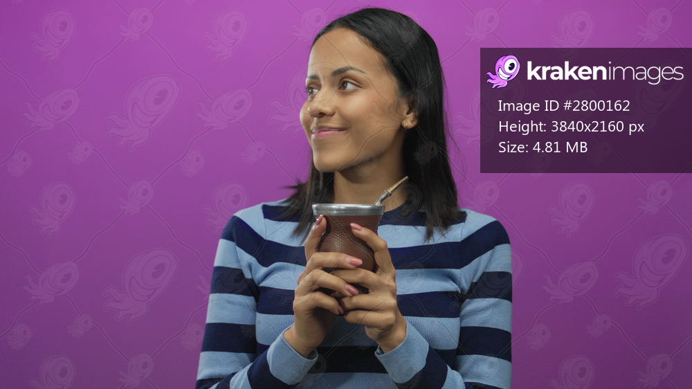Woman holding mate cup over pink background seems thoughtful in striped sweater looking sideways on an isolated bright wall adding an intriguing atmosphere to the image. - Kraken Images