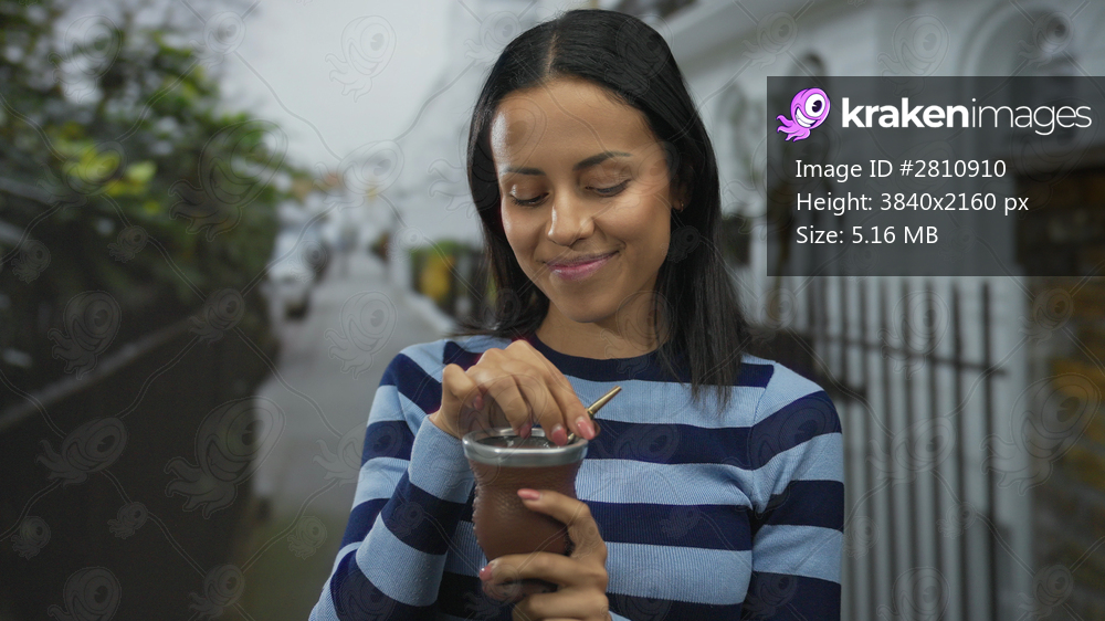 Woman holding mate drink outdoors on a street, wearing a striped sweater, smiling and looking thoughtful.