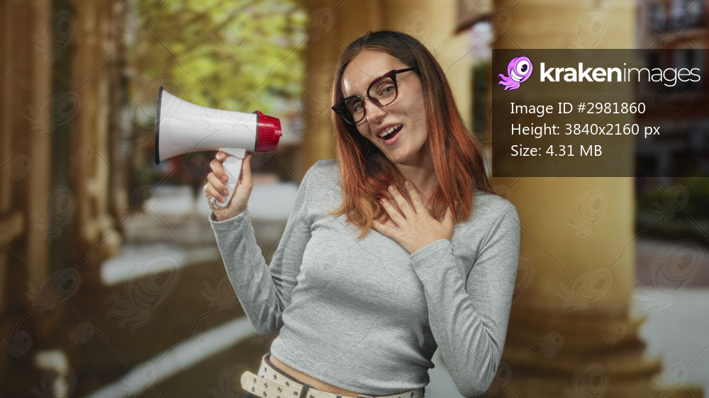 Woman holding megaphone with hand on chest in a stone building colonnade, wearing glasses and grey top; sincere appeal.