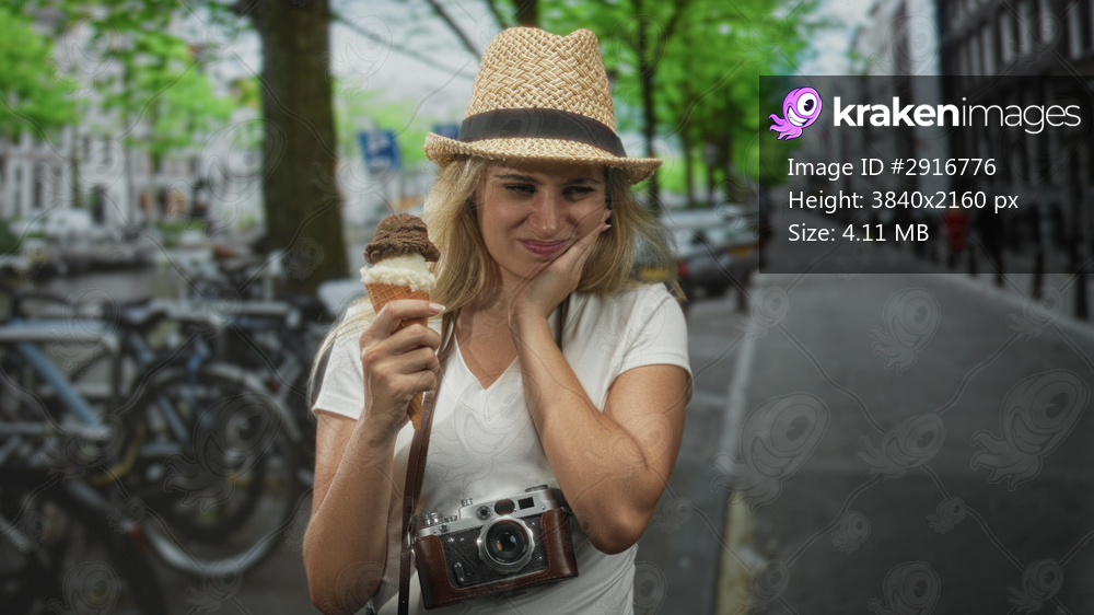 Woman holding melting ice cream cone, hand to cheek and wincing on a street by parked bikes and buildings with a camera around her neck; toothache discomfort. - Kraken Images