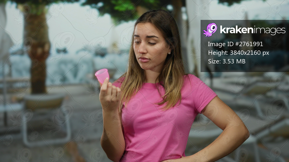 Woman holding menstrual cup outdoors at resort pool expressing curiosity wearing pink shirt with lounge chairs and greenery in the background.