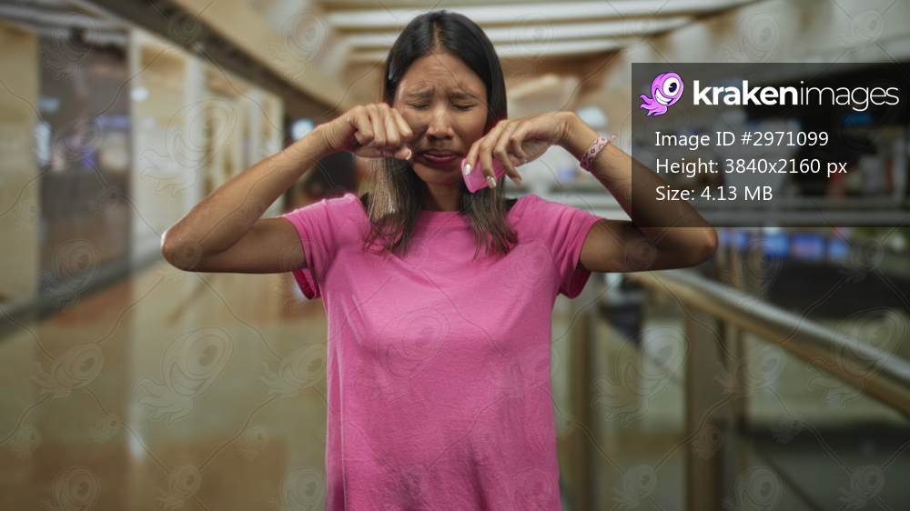 Woman holding menstrual cup wipes eyes with hand in airport terminal walkway; embarrassment vulnerability.