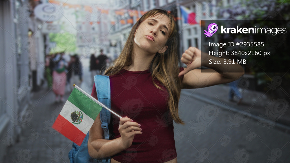 Woman holding mexican flag with thumbs down gesture on street with backpack visible near shops; disapproval.