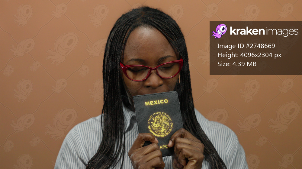 Woman holding mexican passport with eyes closed against a brown background wearing red glasses indicating travel and identity concepts.