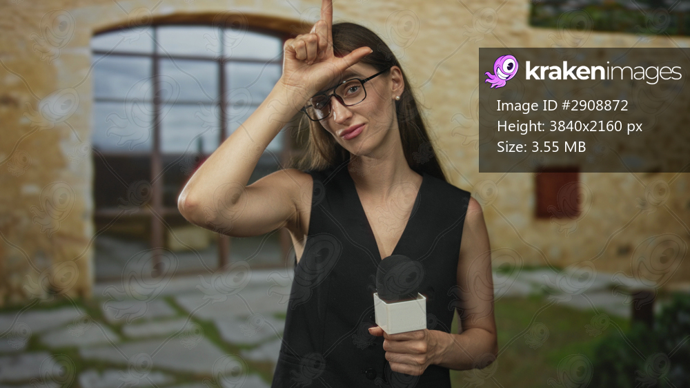Woman holding microphone makes l sign on forehead near arched window of a stone building entrance; sarcasm reporting.