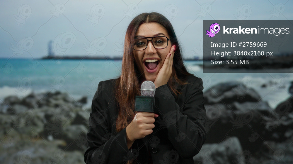 Woman holding microphone on beach as reporter on outdoor seaside location wearing glasses appears surprised with ocean backdrop under clear sky.