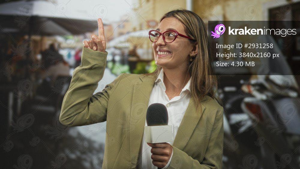 Woman holding microphone points index finger upward on street with scooters and cafe tables and blurred pedestrians; confidence live reporting.