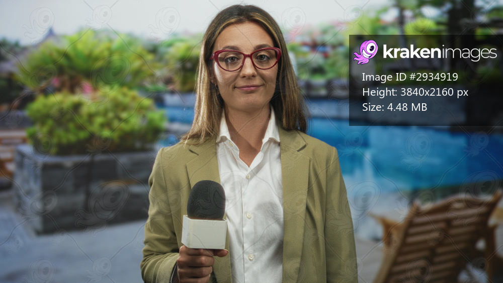 Woman holding microphone poolside at hotel building while gesturing with arm toward lounge chairs; confidence on assignment.