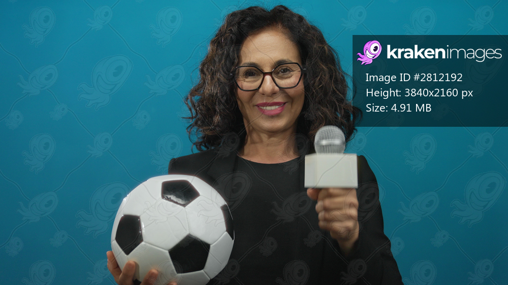 Woman holding microphone and soccer ball against blue background isolated smiling professional reporter lively sports news.