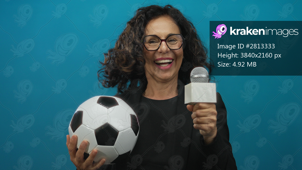 Woman holding microphone and soccer ball against blue background isolated smiling professional reporter lively sports news.