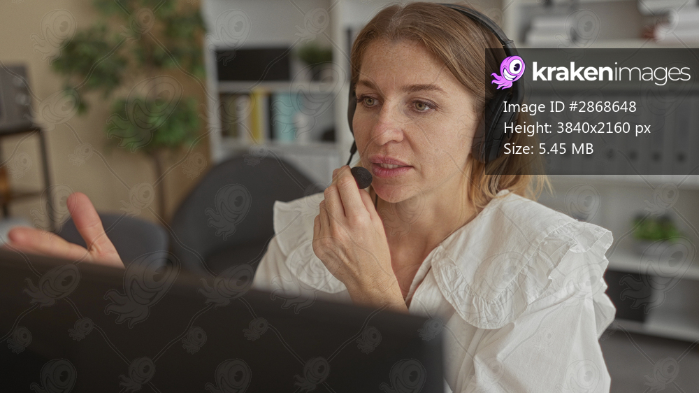 Woman holding microphone to mouth, gesturing with hands in office building; concentration remote communication.