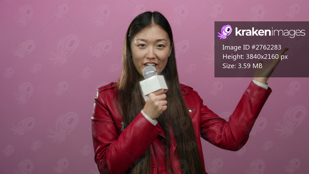 Woman holding microphone wearing red jacket against pink background exuding modern style vibrant expression emphasizing female confidence performance interaction asian culture