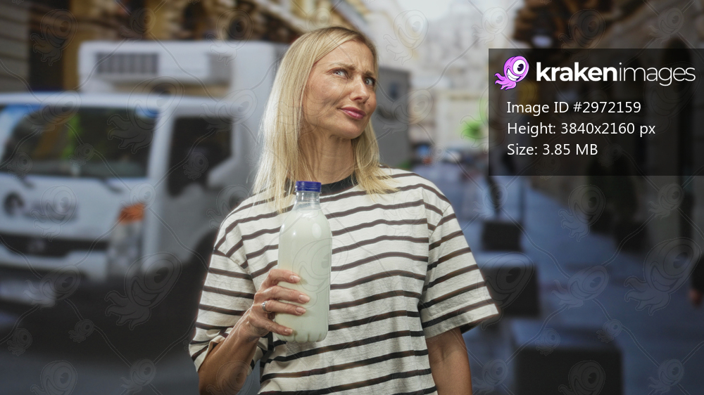 Woman holding milk bottle with hand against chest, striped shirt visible, blonde middle age, gazing upward while standing on a busy city street with scooters and delivery van; contemplation. - Kraken Images