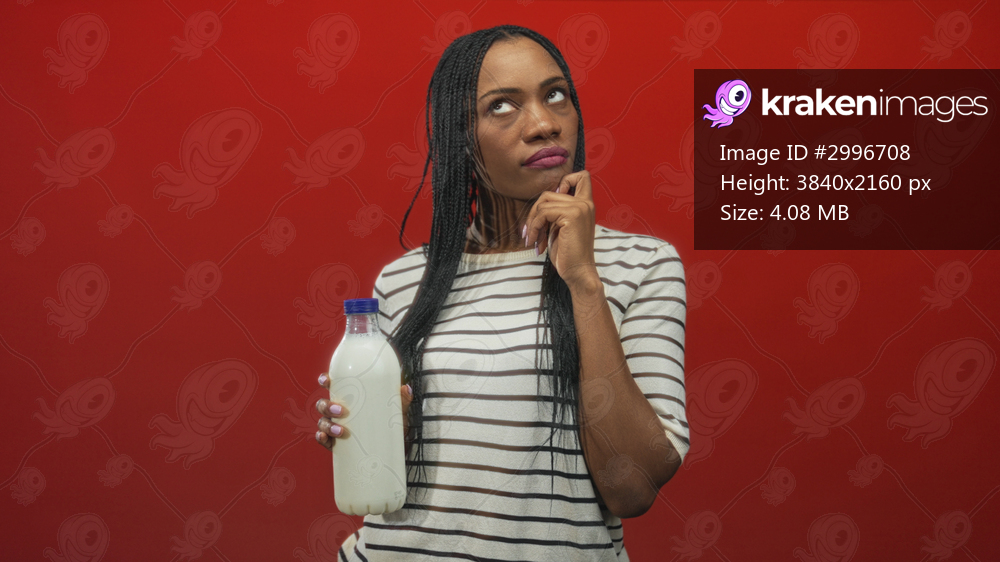 Woman holding milk bottle, hand to chin, striped shirt in studio with red backdrop and poised posture; thoughtful reflection.