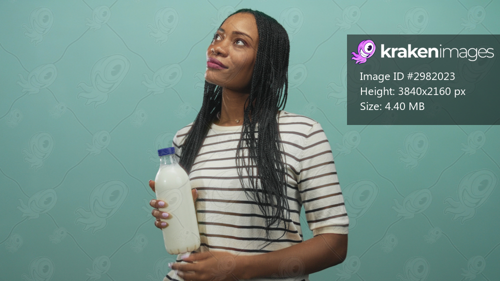 Woman holding milk bottle with hands visible in studio, striped shirt and braided hair, standing against teal backdrop with gentle pose; gentle contemplation.