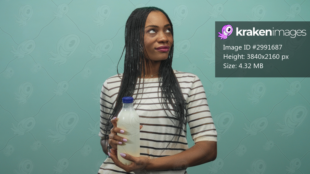 Woman holding milk bottle with hands visible in studio, striped shirt and braided hair, standing against teal backdrop with gentle pose; gentle contemplation.