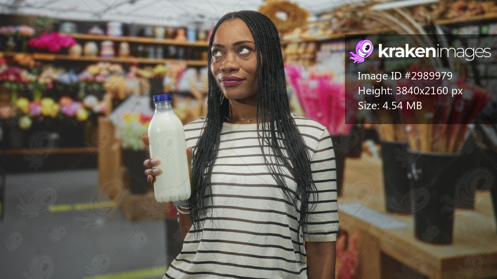 Woman holding milk bottle in hand at flower market stall with floral buckets and shelves, wearing striped shirt and braids; contemplation and choice.