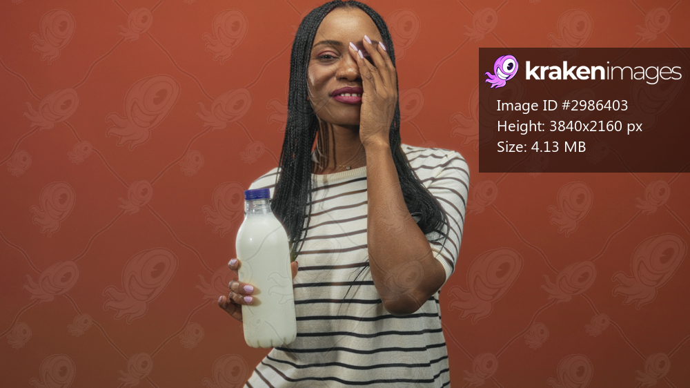 Woman holding milk bottle in striped shirt, hand covering one eye and smiling against an orange studio wall; playful joy.