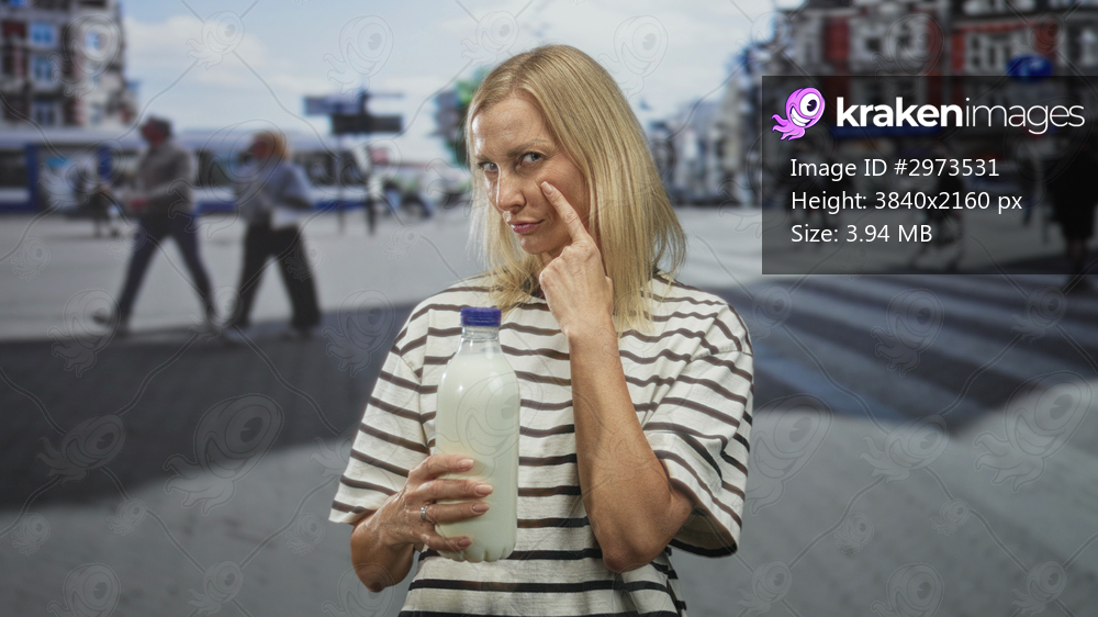 Woman holding milk bottle points finger to cheek in busy urban street with tram and cyclists nearby; contemplation curiosity.
