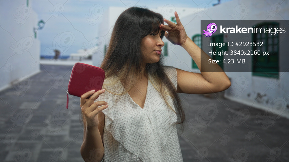 Woman holding mirror and shielding forehead on street near white building with green doors and flagstone pavement; discomfort sun.