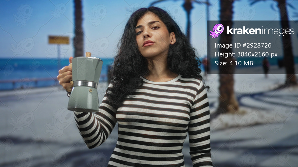 Woman holding moka pot on street by the seaside with hand raised and closed eyes; morning ritual serenity.