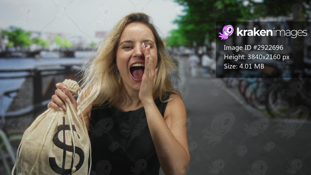 Woman holding money bag and cupping hand to mouth on street in amsterdam; wealth success excitement.