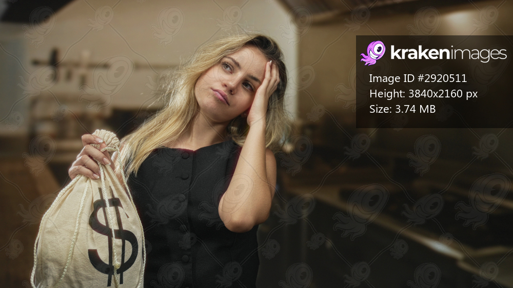 Woman holding money bag with dollar sign, hand to temple in kitchen near stove and counter; tired resignation.