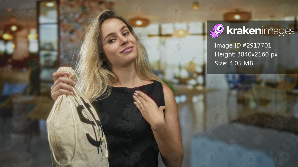 Woman holding money bag with hand on chest in building lobby near hotel seating area, rope handle visible and canvas texture clear; confidence trust.