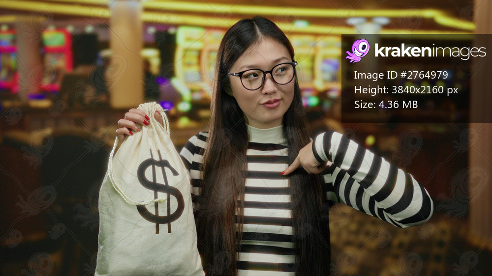 Woman holding money bag in vibrant casino with bright slot machines and focused expression