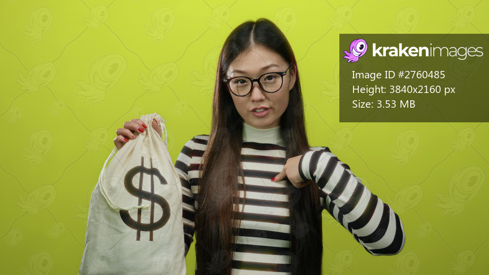 Woman holding money bag on yellow background, confident expression, long hair and glasses, wearing striped shirt, isolated vibrant scene, financial success theme.