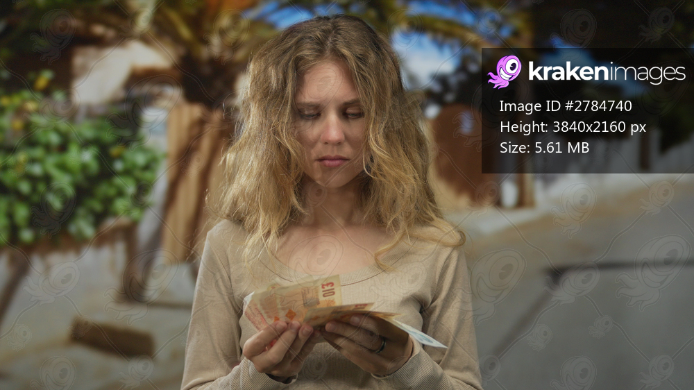 Woman holding money counting bills on a street appears as a blonde young figure looking anxious and concerned outdoors in a neighborhood.