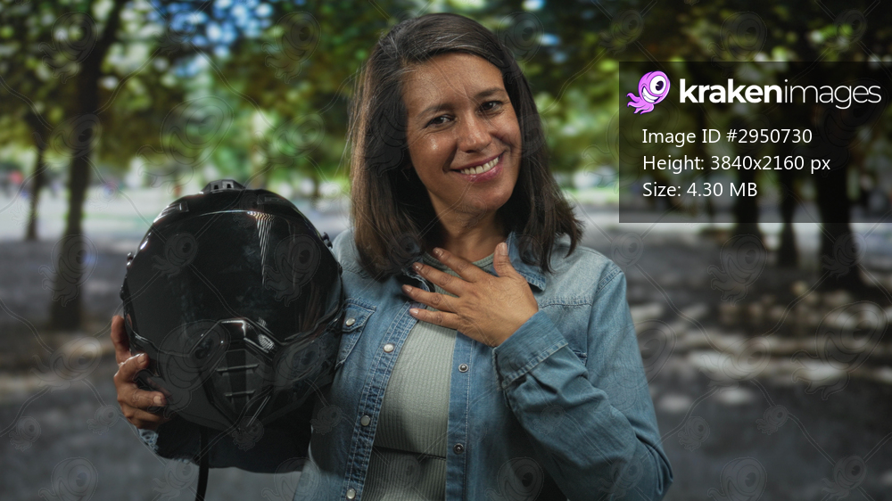 Woman holding motorbike helmet, hand on chest, smiling gesture on a tree lined street; gratitude confidence.