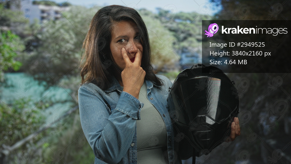 Woman holding motorcycle helmet makes v sign with hand to face in forest near river and trees, denim jacket visible; adventure confidence.