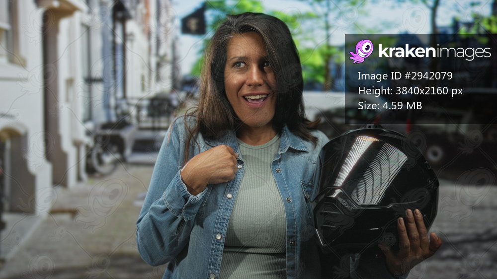 Woman holding motorcycle helmet and touching chest while speaking on a street with parked cars and bicycles; confidence.