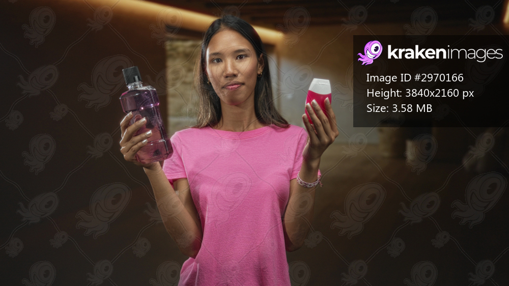 Woman holding mouthwash bottle and pink toothpaste tube, inspecting labels in studio setting; doubt choice oral care.