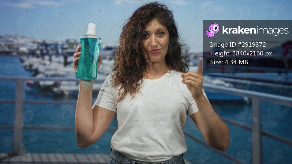 Woman holding mouthwash bottle points finger at port marina railing on seaside pier, outdoors; hygiene advice caution.