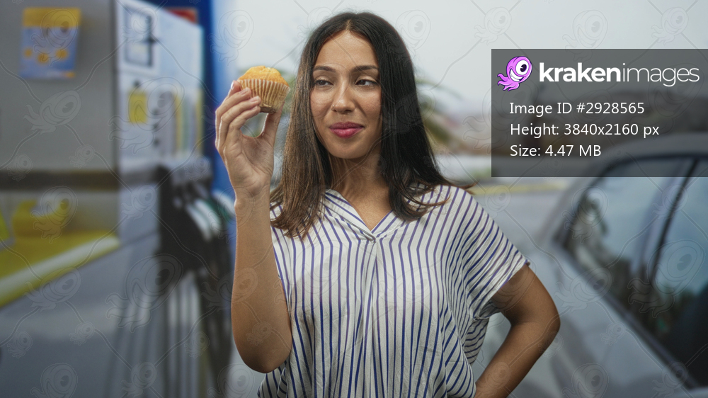 Woman holding muffin with bare hand at street petrol station, smiling toward camera; cheerful snack moment.