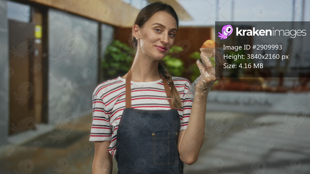 Woman holding muffin with gloved hand at building entrance in apron and striped shirt; quiet pride homemade baking.