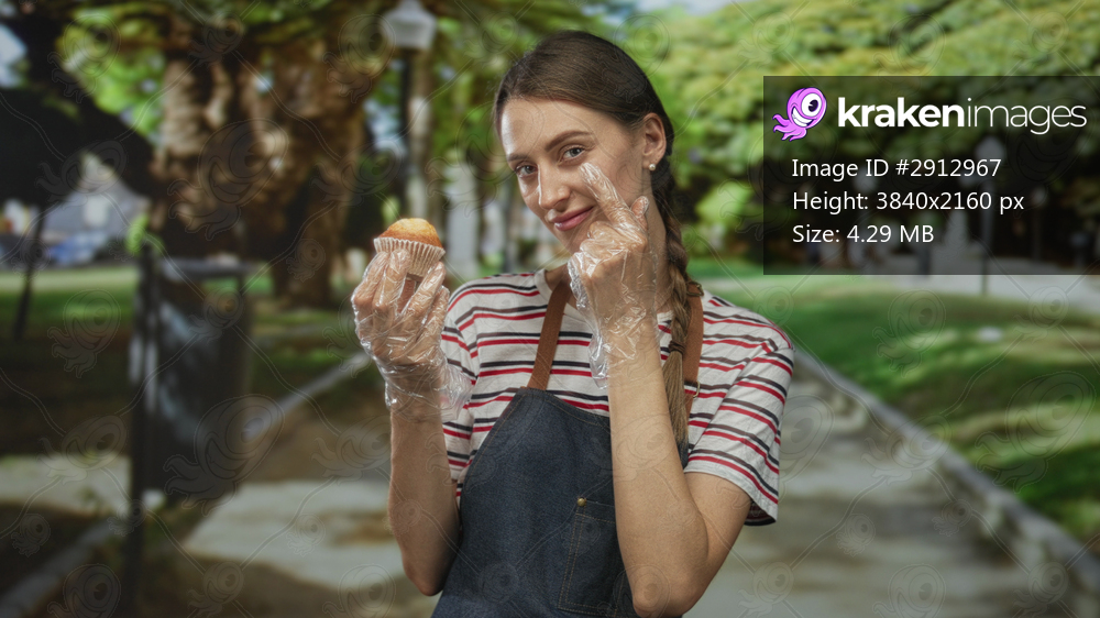 Woman holding muffin with gloved hand and pointing finger to cheek while wearing apron and striped shirt on street path by trees and lamp posts; friendly service. - Kraken Images