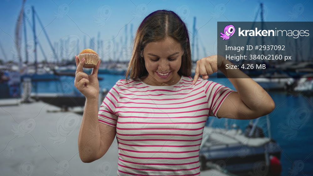 Woman holding muffin in left hand and points finger to muffin while smiling at a port marina with boats and dock in clear daylight; playful.