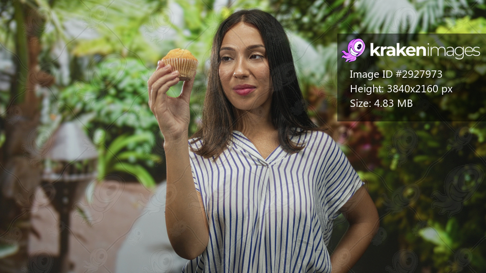 Woman holding muffin with raised hand in park amid green foliage and path wearing striped blouse, brunette hair visible; curiosity appetite.