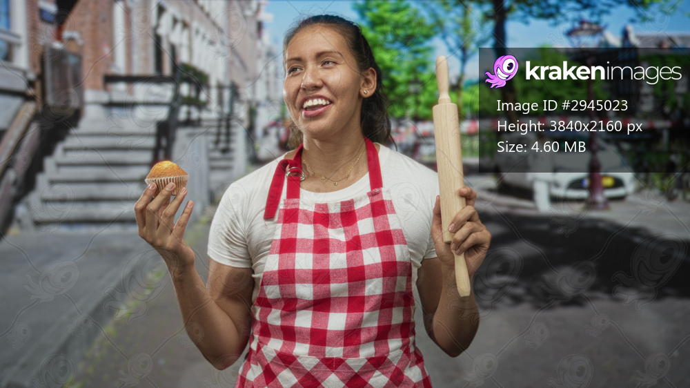 Woman holding muffin and rolling pin on a city street wearing a red checked apron, identified as cook; home baking joy.