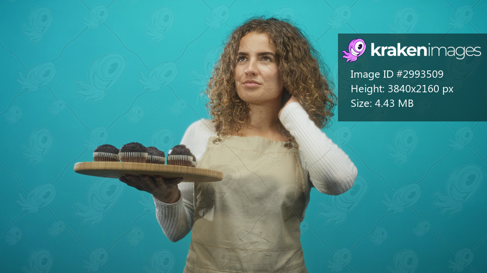 Woman holding muffins on a wooden board with one hand and hand at neck gesture in a studio; thoughtful moment.