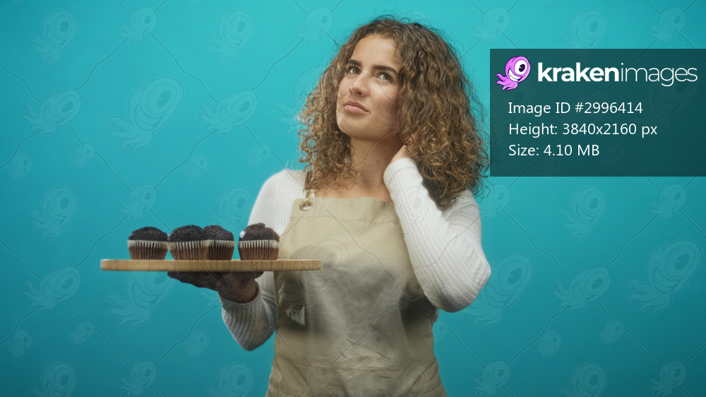 Woman holding muffins on a wooden board with one hand and hand at neck gesture in a studio; thoughtful moment.