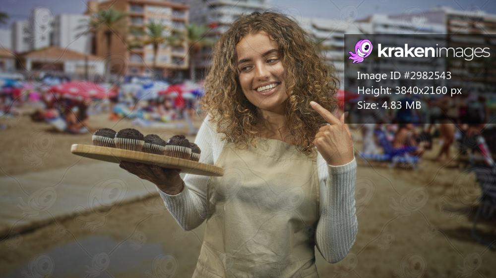 Woman holding muffins points finger to cheek near seaside building while wearing apron and tray; joyful hospitality.